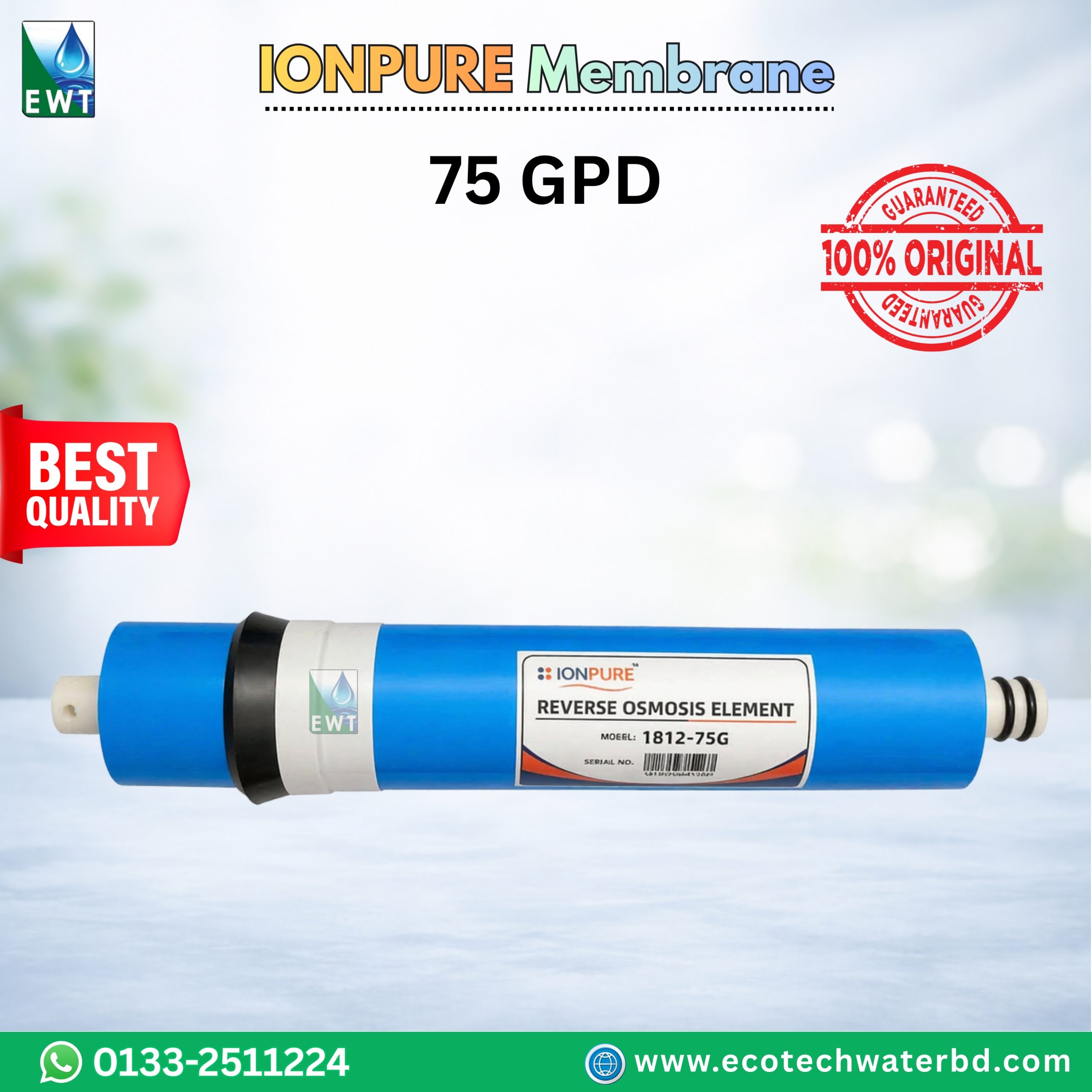 IONPURE 75 GPD RO Membrane একটি উচ্চ কার্যক্ষমতা সম্পন্ন Reverse Osmosis (RO) filtration membrane, যা উন্নত Thin Film Composite (TFC) প্রযুক্তির মাধ্যমে পানির মধ্যে থাকা ক্ষতিকর contaminants, heavy metals, bacteria এবং dissolved solids দূর করে অত্যন্ত বিশুদ্ধ পানি নিশ্চিত করে। এটি ঘরোয়া ও ইন্ডাস্ট্রিয়াল RO water purifier system এর জন্য আদর্শ একটি কম্পোনেন্ট।